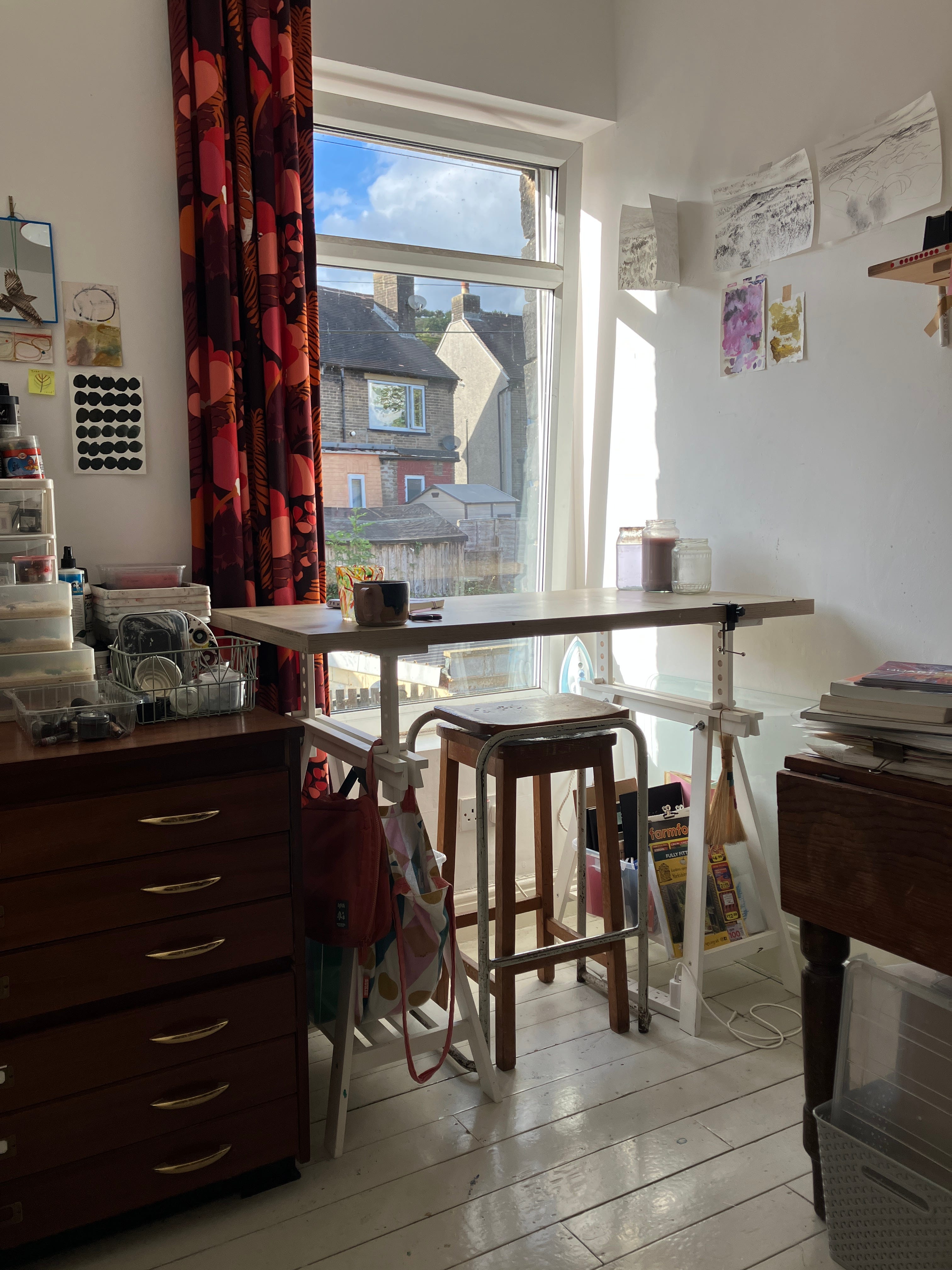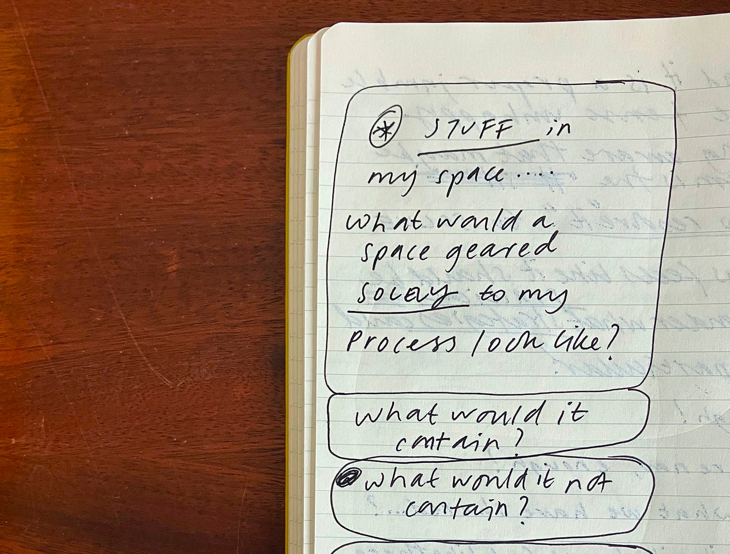 Write about a space or place that has supported you creatively. Connect with the memory of how that felt. Remember as much detail as you can about the space and the stuff in the space. What aspect (however small) of that space could you bring into your space today?